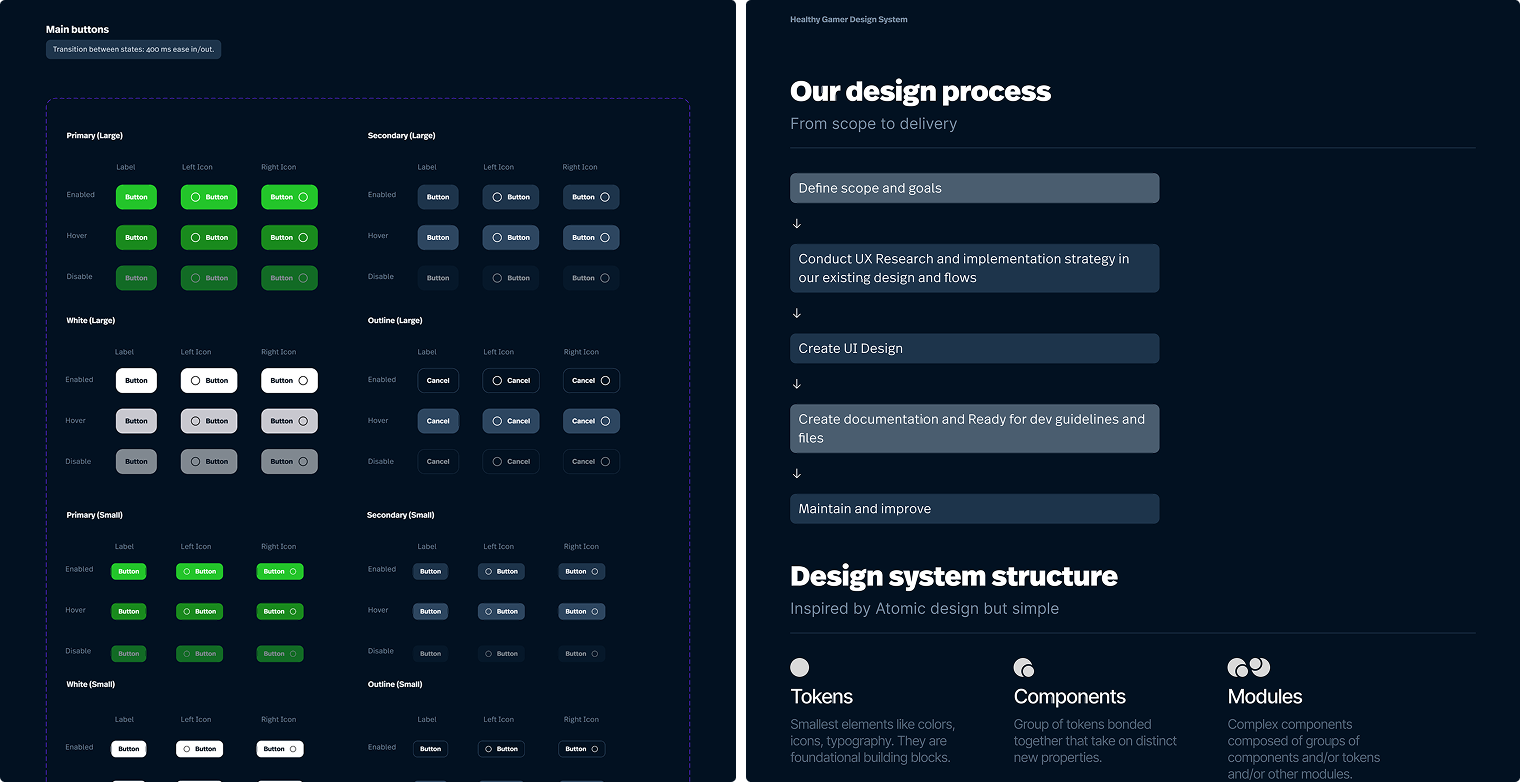 This situation has led to various inconsistencies in the visual and functional aspects of the designs, ultimately making maintenance and updates a much more challenging and time-consuming process but also impact directly the user experience Healthy Gamer offered to their clients.